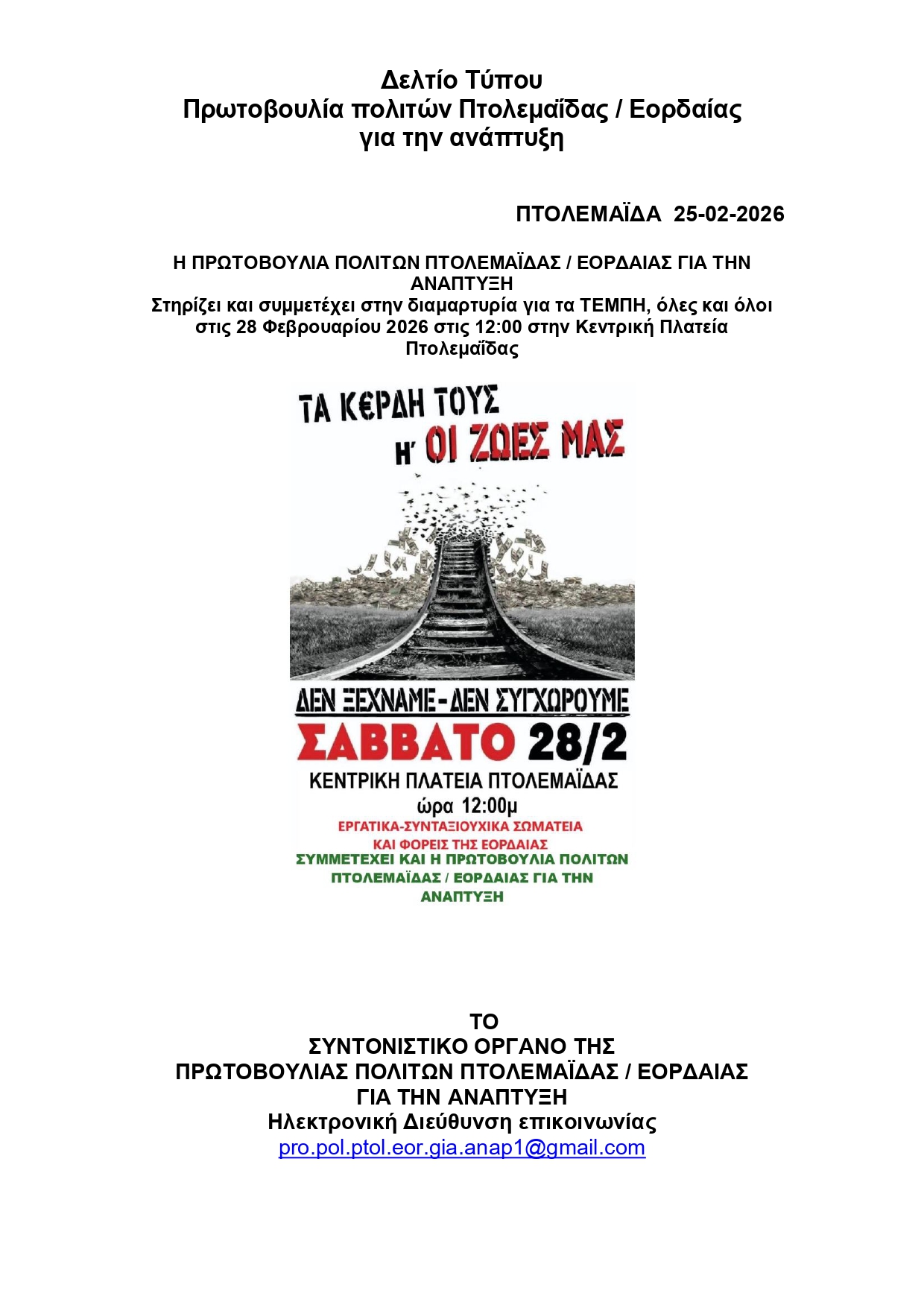 Πρωτοβουλία πολιτών Πτολεμαΐδας / Εορδαίας για την ανάπτυξηΣτηρίζει και συμμετέχει στην διαμαρτυρία για τα ΤΕΜΠΗ, όλες και όλοι στις 28 Φεβρουαρίου 2026 στις 12:00 στην Κεντρική Πλατεία Πτολεμαΐδας