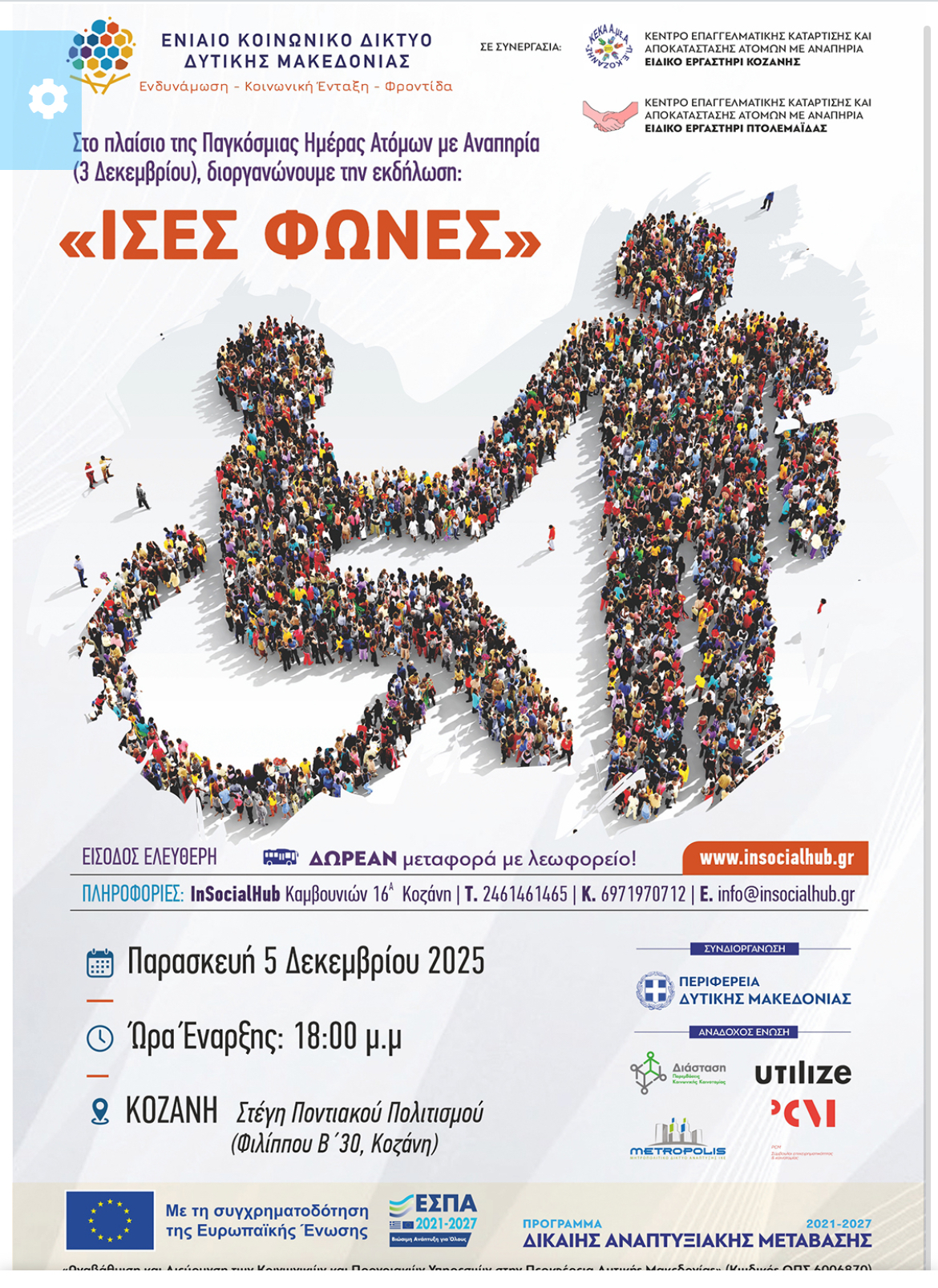 Στο πλαίσιο της Παγκόσμιας Ημέρας Ατόμων με Αναπηρία (3 Δεκεμβρίου), η Περιφέρεια Δυτικής Μακεδονίας και το Ενιαίο Κοινωνικό Δίκτυο, σε συνεργασία με τα Κέντρα Επαγγελματικής Κατάρτισης και Αποκατάστασης Ατόμων με Αναπηρία (Ειδικά Εργαστήρια Κοζάνης και Πτολεμαΐδας), διοργανώνουν την εκδήλωση «Ίσες Φωνές».