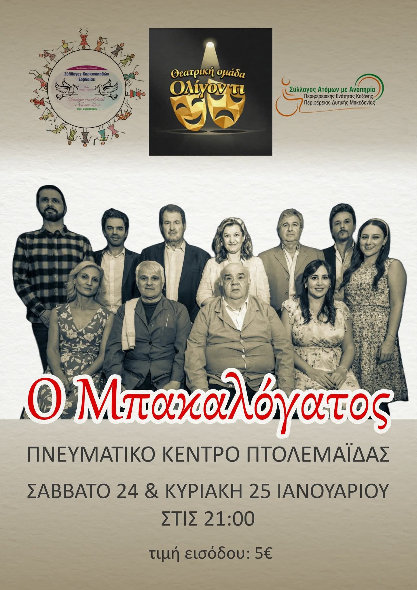 Ο Σύλ. Καρκινοπαθών Εορδαίας και ο Σύλλογος Ατόμων με Αναπηρία Π.Ε. Κοζάνης Περιφέρειας Δυτικής Μακεδονίας σε συνεργασία με τη θεατρική ομάδα ΄΄ΟΛΙΓΟΝ ΤΙ΄΄ παρουσιάζουν το έργο των Χρήστου και Γιώργου Γιαννακόπουλου «Ο Μπακαλόγατος» (Της κακομοίρας).