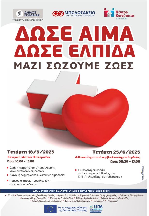 Ο Δήμος Εορδαίας και το Κέντρο Κοινότητας του Δήμου Εορδαίας, σε συνεργασία με το Γενικό Νοσοκομείο Πτολεμαΐδας «Μποδοσάκειο» και το Κέντρο Υγείας Πτολεμαΐδας, στο πλαίσιο της ενίσχυσης της εθνικής προσπάθειας για την κάλυψη των αναγκών σε αίμα, συνδιοργανώνουν δράσεις για την εθελοντική αιμοδοσία ως εξής: